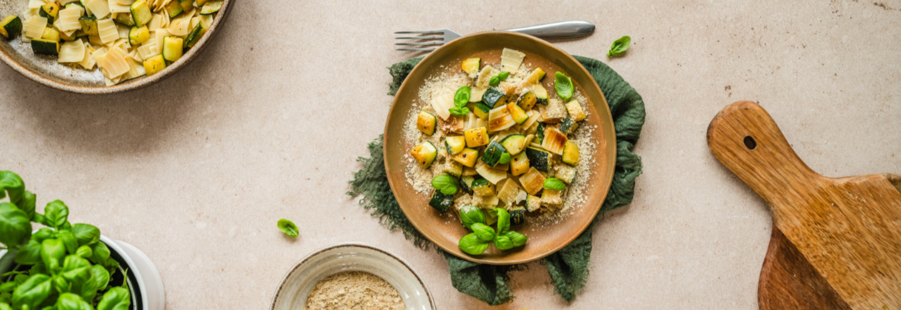 Wymieszaj cukinię z ugotowanym makaronem. Posyp płatkami suszonych drożdży i udekoruj bazylią.