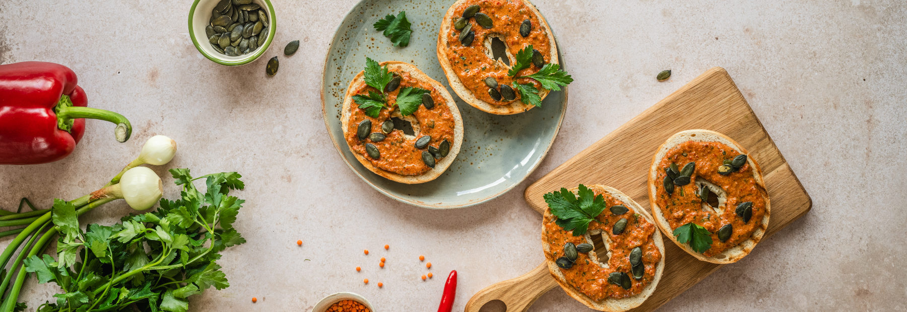 Podpiecz bajgle w tosterze lub na suchej patelni grillowej. Rozsmaruj pastę na wierzchu i posyp pestkami dyni.