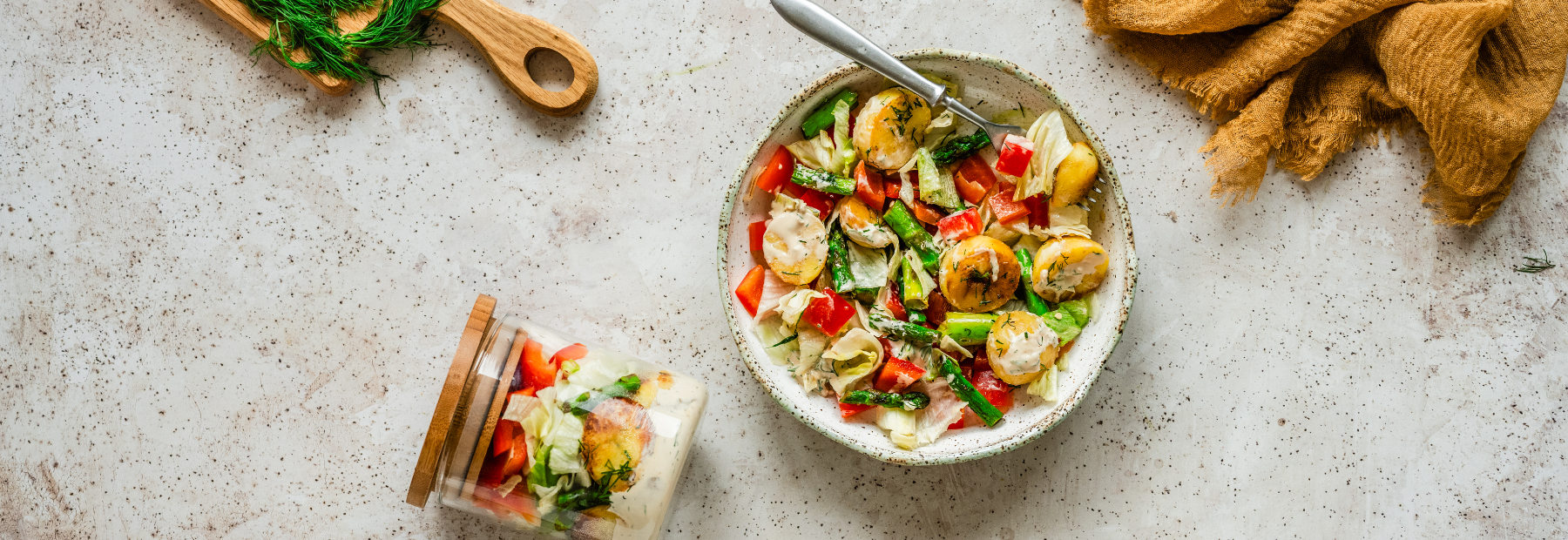 Pokrój szparagi na małe kawałki i podsmaż na tej samej patelni, co ziemniaki. Dopraw Sosem sojowym Kikkoman o obniżonej zawartości soli i pieprzem. Ułóż w słoiczkach z sałatą i pokrojoną w kostkę papryką. Przed podaniem przełóż na talerz i dobrze wymieszaj.